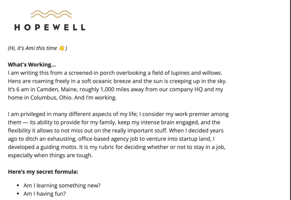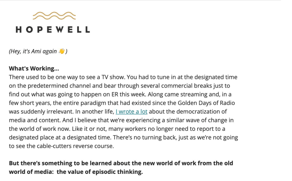 Industry newsletter for Hopewell. “Updates from the front lines of work.” Designed to create thought leadership around the future of work specifically for workplace design and office furniture firms.